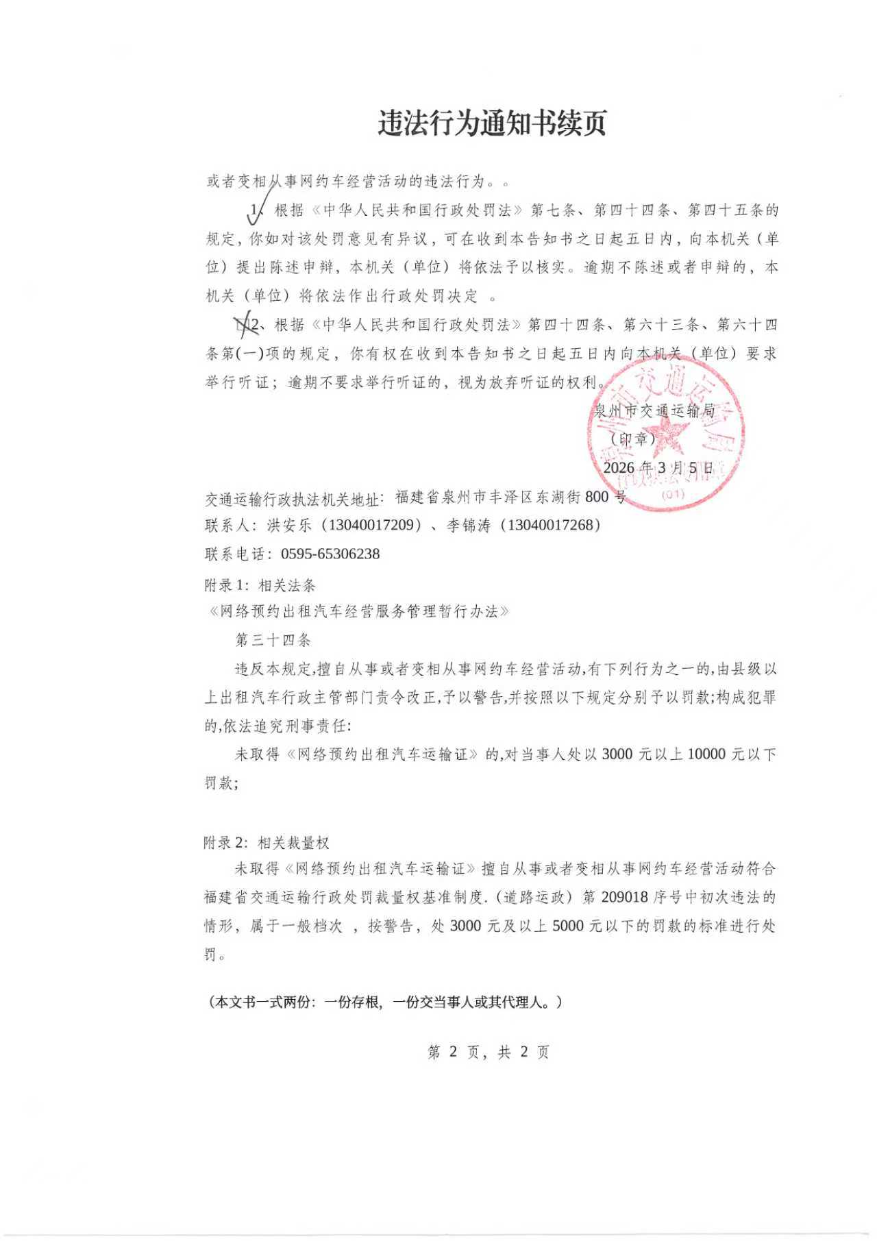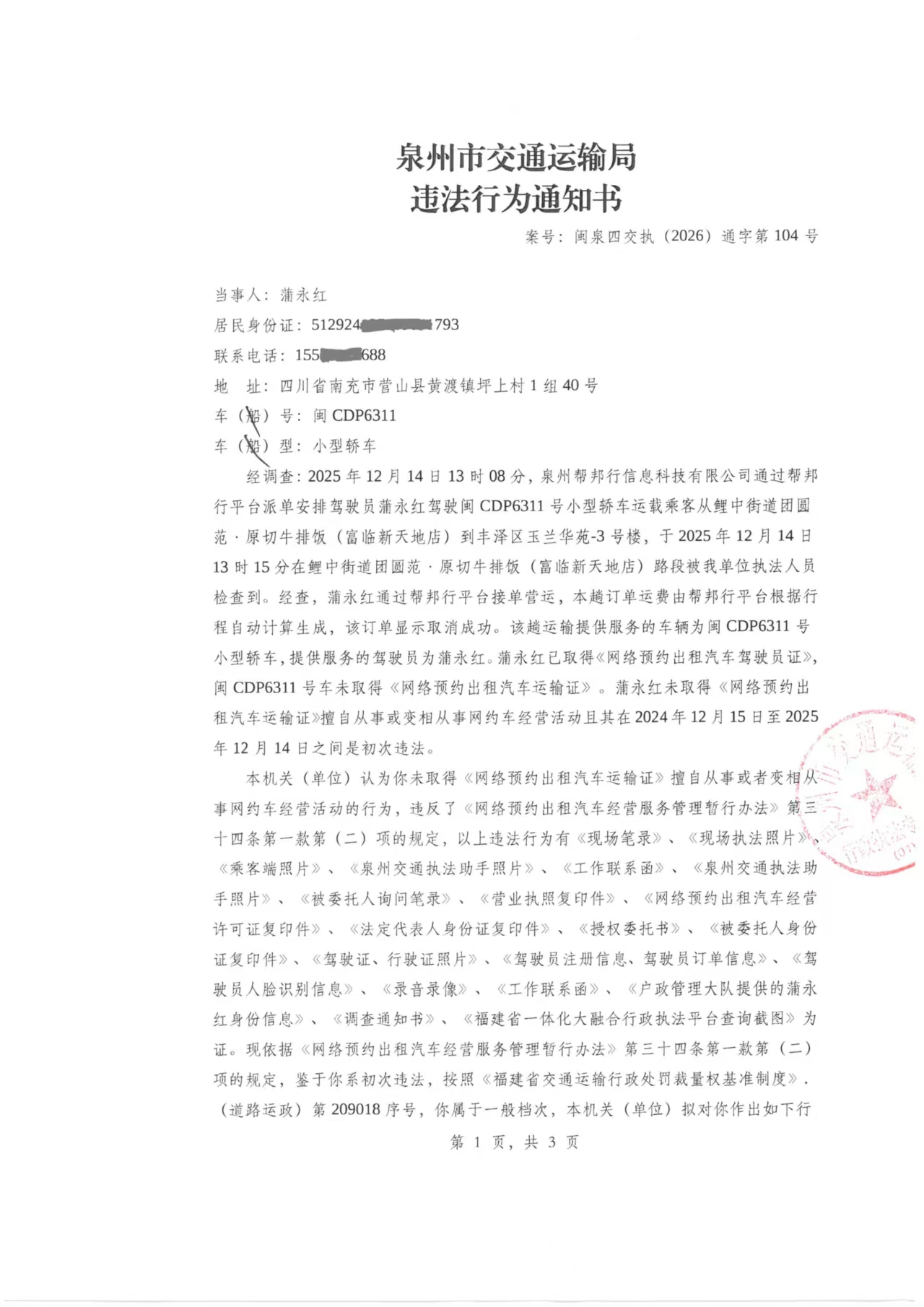 附件:《违法行为通知书》{闽泉四交执(2026)通字第104号}