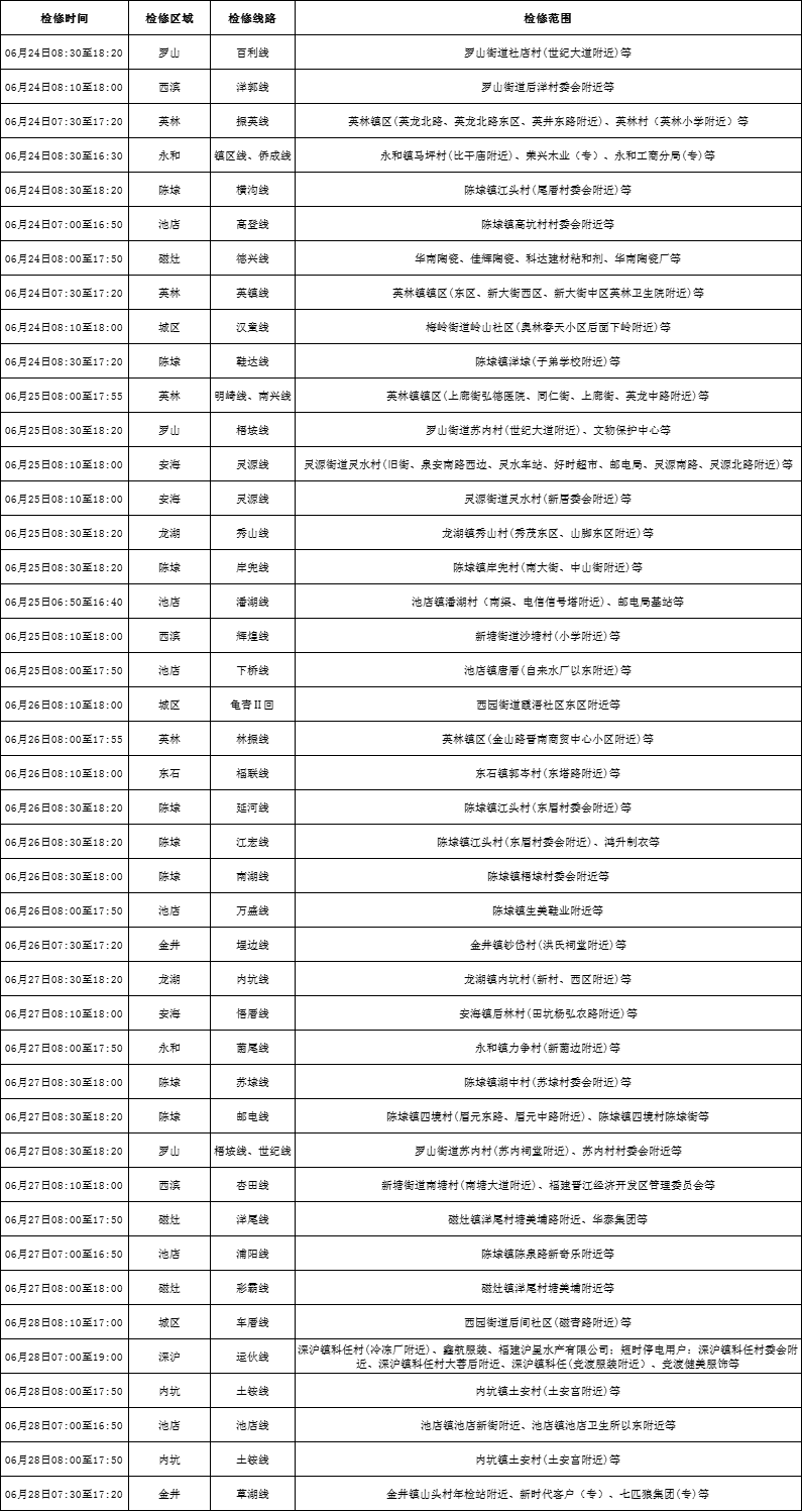 因客户工程、配改工程、用户申请、市政工程、低压工程需要,拟对下列线路进行电力检修,请检修范围内各用电客户做好准备。若遇下雨等特殊原因,可能取消相应区域检修。实际送电时间以现场施工进度为准。
