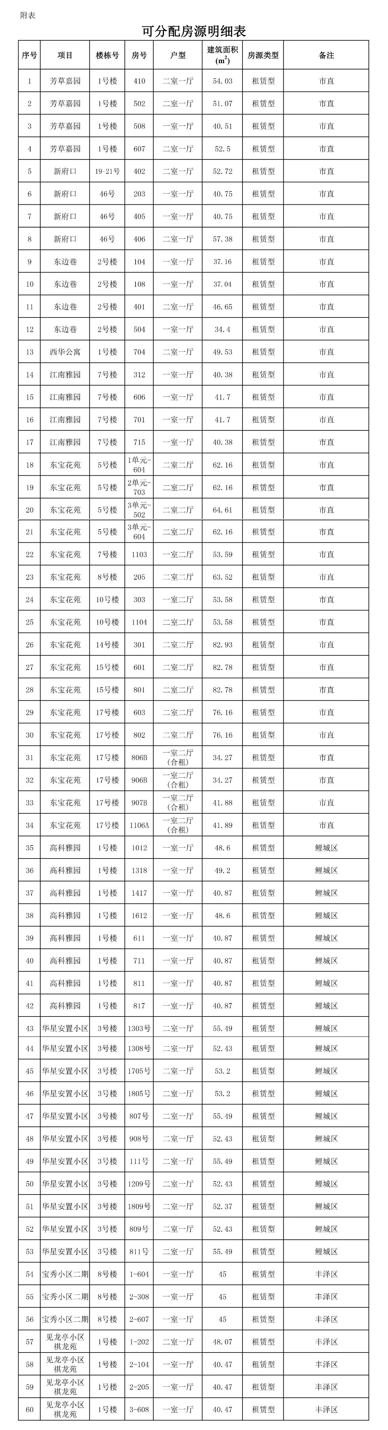 本轮选房全部为租赁型房源,共计60套(其中:市直34套、鲤城区19套、丰泽区7套),分别为:一房型30套【其中:市直16套(含4套合租一房型)、鲤城区8套、丰泽区6套】、二房型30套(市直18套、鲤城区11套、丰泽区1套)。