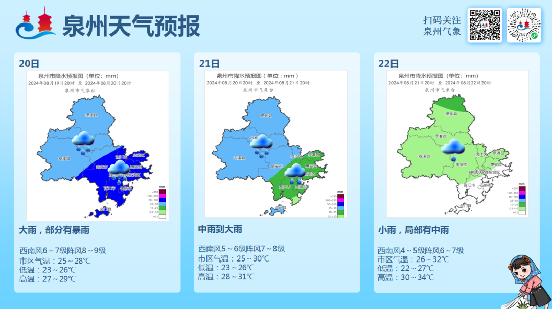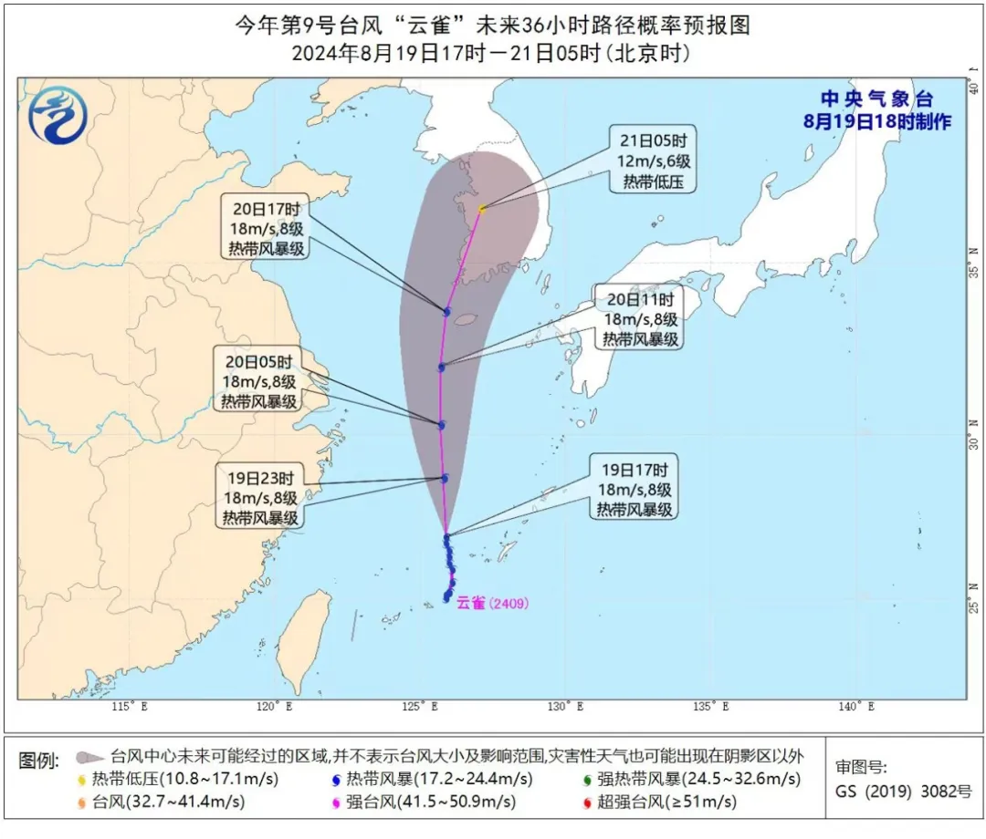 (2)暴雨灾害风险:今天夜间到8月20日夜间中南部地区暴雨灾害风险较高,注意防范局地强降水可能引发的山洪和城乡积涝、塌方、滑坡等次生灾害,特别注意防范强降水的叠加效应。