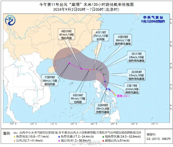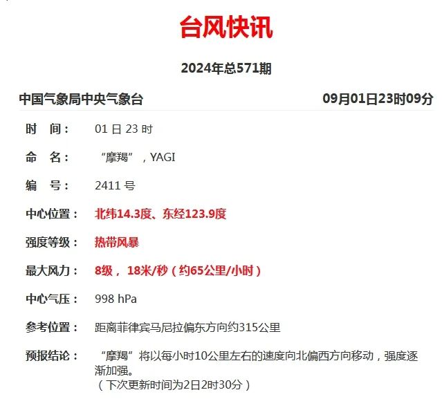 预计,“摩羯”将以每小时15~20公里的速度向偏北方向移动,强度逐渐加强,3日开始转向西偏北方向移动,并将于5日前后进入南海北部海面,最强可达强台风级或超强台风级(45~52米/秒,14~16级)。