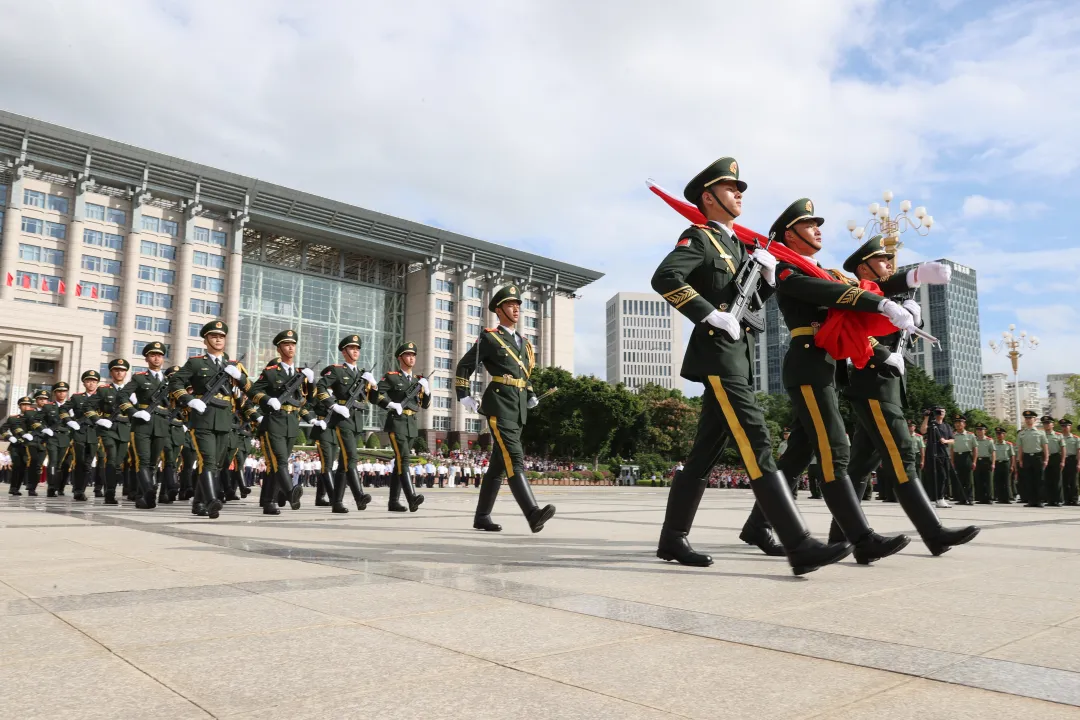 上午8时30分,升旗仪式正式开始。参加仪式的干部群众整齐列队、精神抖擞。英姿飒爽的国旗护卫队迈着铿锵有力的步伐,护送国旗行进至升旗台。伴随着雄壮的《义勇军进行曲》奏响,鲜艳的五星红旗冉冉升起。全体人员面向国旗,公安干警、武警官兵代表行举手礼,其他人员肃立行注目礼。大家齐声高唱国歌,共同祝愿伟大的祖国更加繁荣富强、人民的生活更加幸福美好。