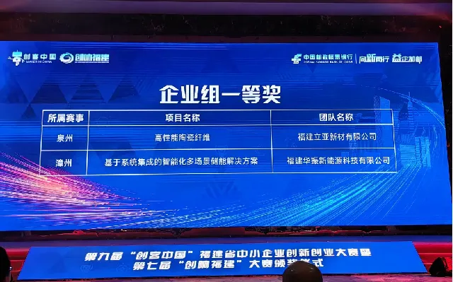 经过现场路演、专家评审、现场打分等环节,最终我市选送的福建立亚新材有限公司“高性能陶瓷纤维”项目脱颖而出,获得全省总决赛企业组第一名,创造我市项目参加该项赛事的历史最好成绩,将代表我省晋级全国赛。