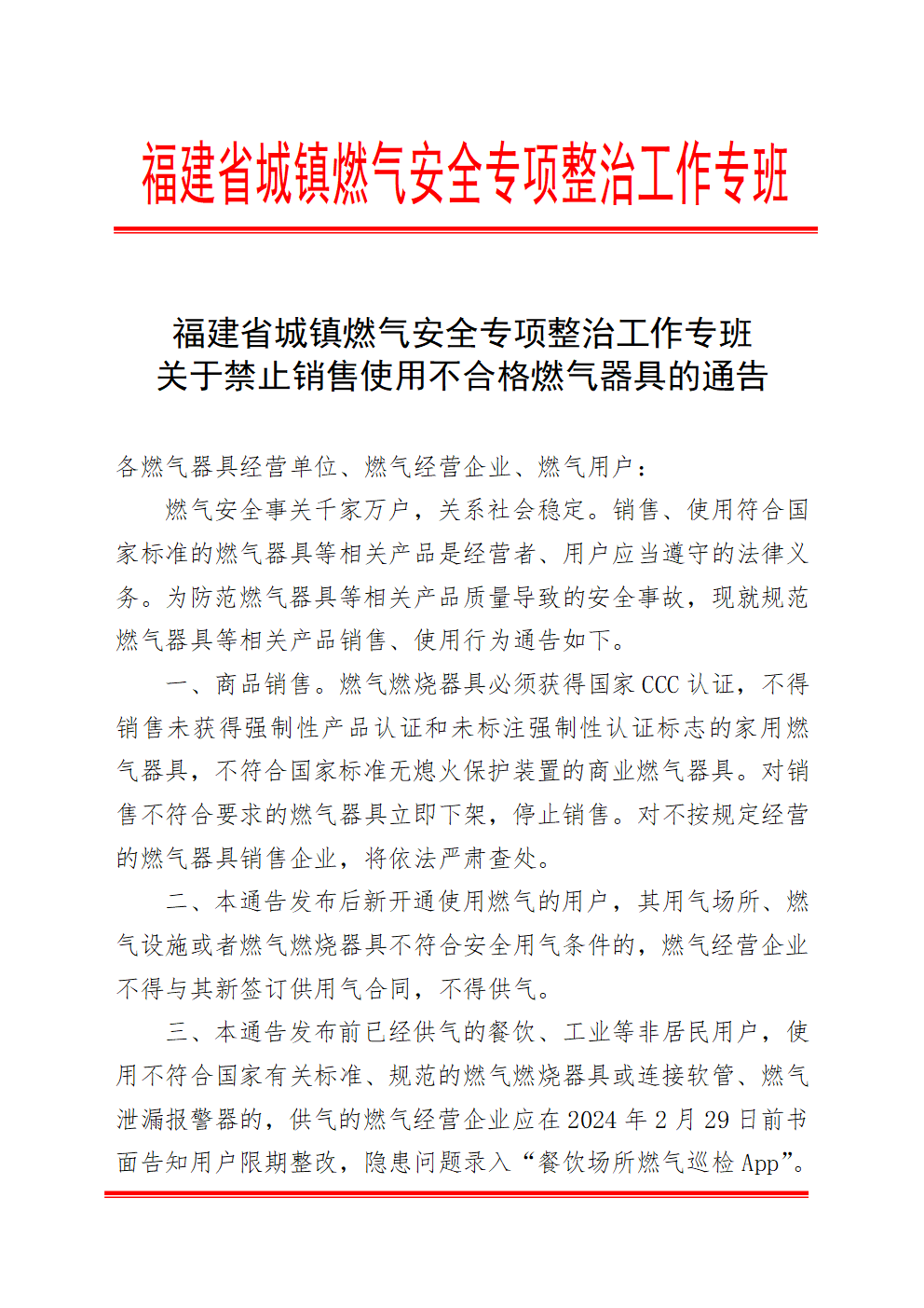 附:《福建省城镇燃气安全专项整治工作专班关于禁止销售使用不合格燃气器具的通告》