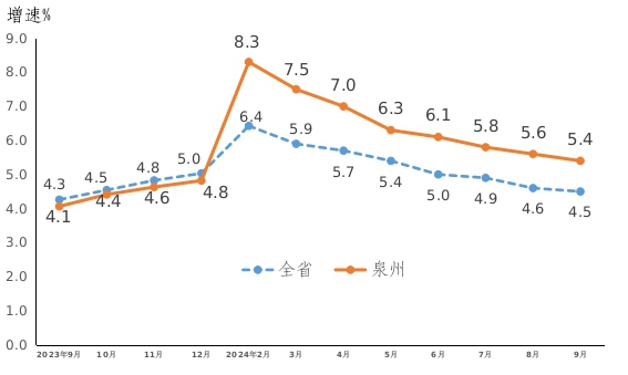 今年以来,泉州市按照省、市各项工作部署,落实落细扩内需促消费政策,消费市场平稳发展。1—9月,社会消费品零售总额4756.41亿元,同比增长5.4%,增速比上年同期提高1.3个百分点,居全省设区市第四位。其中,9月份社会消费品零售总额同比增长3.1%,增速比上月提高0.1个百分点。
