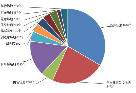 按场地类型,篮球场、全民健身路径、乒乓球场地数量位列前三。其中,篮球场地7926个,占32.25%;全民健身路径场地5471个,占22.26%;乒乓球场地3590个,占14.61%。