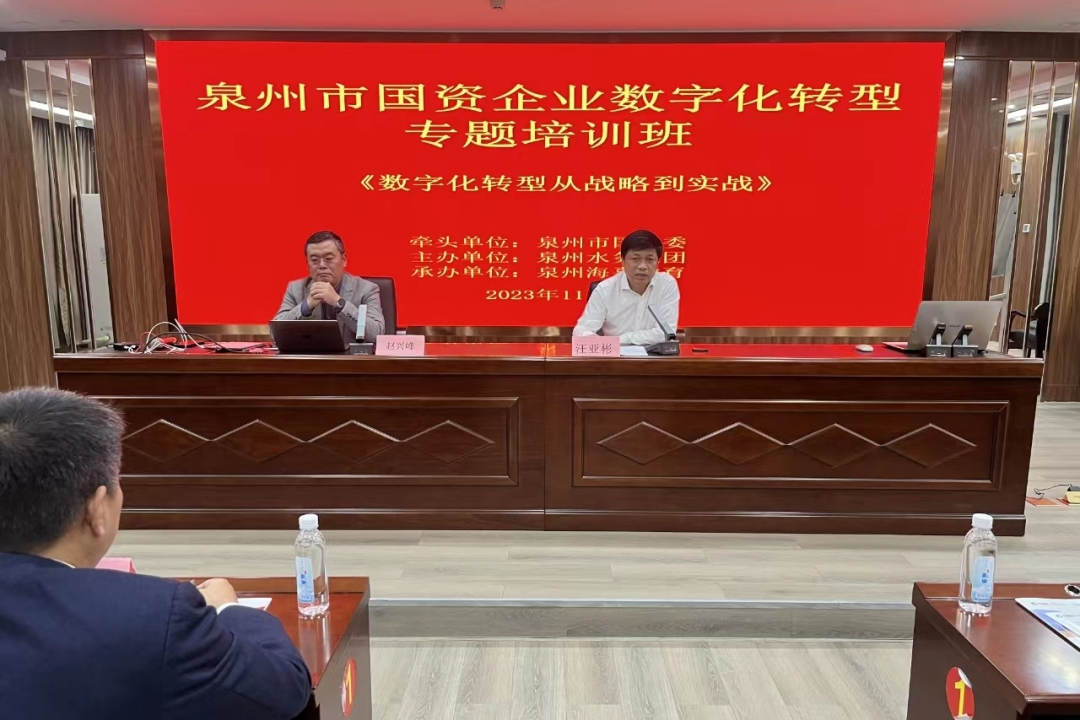 为进一步提高市属国企数字化转型能力,凝聚干部职工加快推进数字化转型合力,由泉州市国资委牵头、泉州水务集团主办的数字化转型专题培训班于11月21日在泉州水务集团举办。市国资委、市属国企相关人员共120多人参加现场培训。本次培训,为期一天。市国资委党委委员、副主任汪亚彬作开班动员。