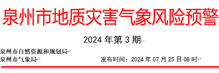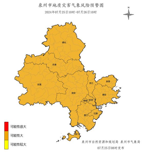 预计,07月25日10时至07月26日10时,鲤城区海滨街道、鲤中街道、开元街道、浮桥街道、金龙街道,丰泽区东湖街道、丰泽街道、泉秀街道、清源街道、华大街道、城东街道、东海街道、北峰街道,洛江区万安街道、双阳街道、罗溪镇、马甲镇、河市镇、虹山乡,泉港区山腰街道、南埔镇、界山镇、后龙镇、峰尾镇、前黄镇、涂岭镇,惠安县螺城镇、螺阳镇、黄塘镇、紫山镇、洛阳镇、东园镇、张坂镇、崇武镇、山霞镇、涂寨镇、东岭镇、东桥镇、净峰镇、小岞镇、辋川镇、百崎回族乡,安溪县凤城镇、蓬莱镇、湖头镇、官桥镇、剑斗镇、城厢镇、金谷镇、龙门镇、虎邱镇、芦田镇、感德镇、魁斗镇、西坪镇、参内镇、白濑乡、湖上乡、尚卿乡、大坪乡、龙涓乡、长卿镇、蓝田乡、祥华乡、桃舟乡、福田乡,永春县桃城镇、五里街道、一都镇、下洋镇、蓬壶镇、达埔镇、吾峰镇、石鼓镇、岵山镇、东平镇、湖洋镇、坑仔口镇、玉斗镇、锦斗镇、东关镇、桂洋镇、苏坑镇、仙夹镇、横口乡、呈祥镇、介福乡、外山乡,德化县浔中镇、龙浔镇、三班镇、龙门滩镇、雷峰镇、南埕镇、水口镇、赤水镇、上涌镇、葛坑镇、盖德镇、美湖镇、杨梅乡、汤头乡、桂阳乡、国宝乡、大铭乡、春美乡,金门县,石狮市湖滨街道、凤里街道、灵秀镇、宝盖镇、蚶江镇、祥芝镇、鸿山镇、锦尚镇、永宁镇,晋江市青阳街道、梅岭街道、西园街道、罗山街道、灵源街道、新塘街道、陈埭镇、池店镇、安海镇、磁灶镇、内坑镇、紫帽镇、东石镇、永和镇、英林镇、金井镇、龙湖镇、深沪镇、西滨镇,南安市溪美街道、柳城街道、美林街道、省新镇、仑苍镇、东田镇、英都镇、翔云镇、金淘镇、诗山镇、蓬华镇、码头镇、九都镇、乐峰镇、罗东镇、梅山镇、洪濑镇、洪梅镇、康美镇、丰州镇、霞美镇、水头镇、石井镇、眉山乡、向阳乡,地质灾害气象风险等级为橙色预警,地质灾害发生可能性大,应做好值班值守、监测、巡查和防范,应按有关规定及时组织危险性较大的地灾隐患点和危险区域内的群众转移,确保人民生命安全。