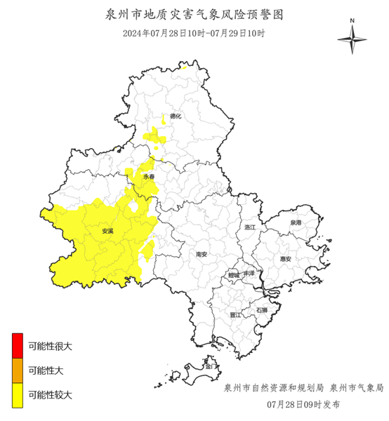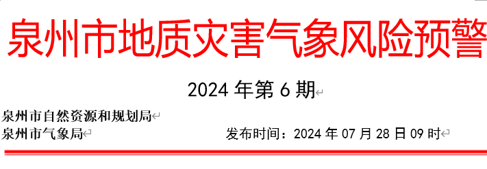 预计,07月28日10时至07月29日10时,安溪县蓬莱镇、湖头镇、官桥镇、剑斗镇、城厢镇、金谷镇、龙门镇、虎邱镇、芦田镇、感德镇、魁斗镇、西坪镇、白濑乡、湖上乡、尚卿乡、大坪乡、龙涓乡、长卿镇、蓝田乡、祥华乡、福田乡,永春县下洋镇、蓬壶镇、达埔镇、坑仔口镇、玉斗镇、锦斗镇、苏坑镇、呈祥镇,德化县浔中镇、龙浔镇、赤水镇、盖德镇、美湖镇、杨梅乡、国宝乡,地质灾害气象风险等级为黄色预警,地质灾害发生可能性较大,应加强对地质灾害隐患点的监测和对高陡边坡、易发泥石流的沟口等易发区的巡查和防范,如果发现地灾险情应及时采取防灾避险措施,确保人民生命安全。