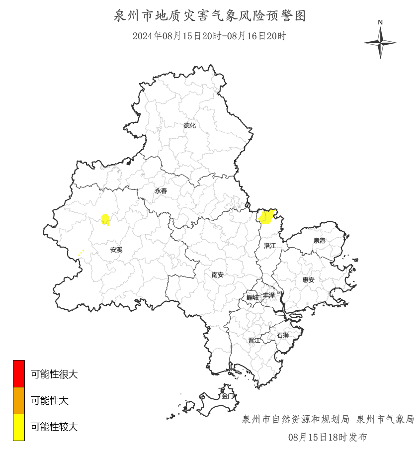 预计,08月15日20时至08月16日20时,洛江区罗溪镇、虹山乡,安溪县感德镇、长卿镇、祥华乡,地质灾害气象风险等级为黄色预警,地质灾害发生可能性较大,应加强对地质灾害隐患点的监测和对高陡边坡、易发泥石流的沟口等易发区的巡查和防范,如果发现地灾险情应及时采取防灾避险措施,确保人民生命安全。