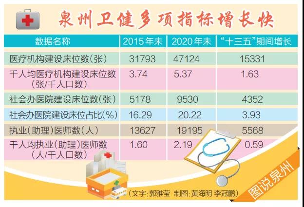过去五年,全市卫健系统围绕建设“健康泉州”,深化改革,积极创新,医疗服务质量和人民群众获得感不断提升。泉州市坚持“大卫生、大健康”理念,扎实推进“健康泉州”建设,人民群众健康水平有了较大提升。2020年,全市常住人口人均预期寿命达78.41岁,比2015年的76.91岁提高1.5岁。 五年来,泉州市坚持补短板、强弱项,医疗资源供给得到大幅扩充。59个医疗卫生重点项目顺利推进,一批社会办医项目投入运营。目前,全市医疗机构床位数达4.71万张,比2015年新增1.53万张,千人均床位数由2015年的3.74张提高到2020年末的5.4张。卫生技术人员总数达50059人,比2015年增加12032人。