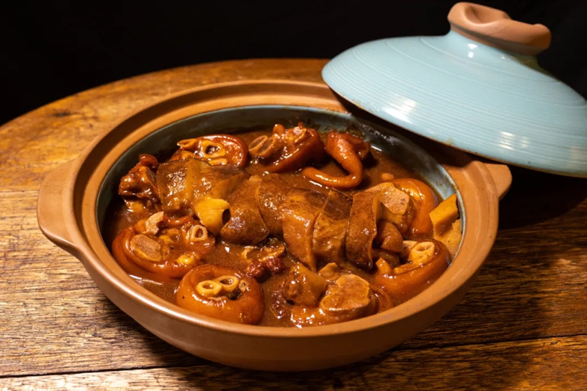 南安翔云生态环境优美,峰峦连绵,自然景观随处可见,植物资源丰富,是动物飞禽宜居之地。当地放养的良种猪生长周期长,营养价值丰富。翔云猪脚的烹饪工序非常讲究,经过民间长期流传,沿袭改进,形成一套完整传统技艺,也成为一道独特的翔云传统美食。猪脚搭配“海八珍”之猪婆参,海陆之材完美结合,酱香四溢,汤汁浓郁香醇、咸鲜适口美味,两者相得益彰,让人欲罢不能。象征着郑成功年轻时由秀才到封王的成长经历。