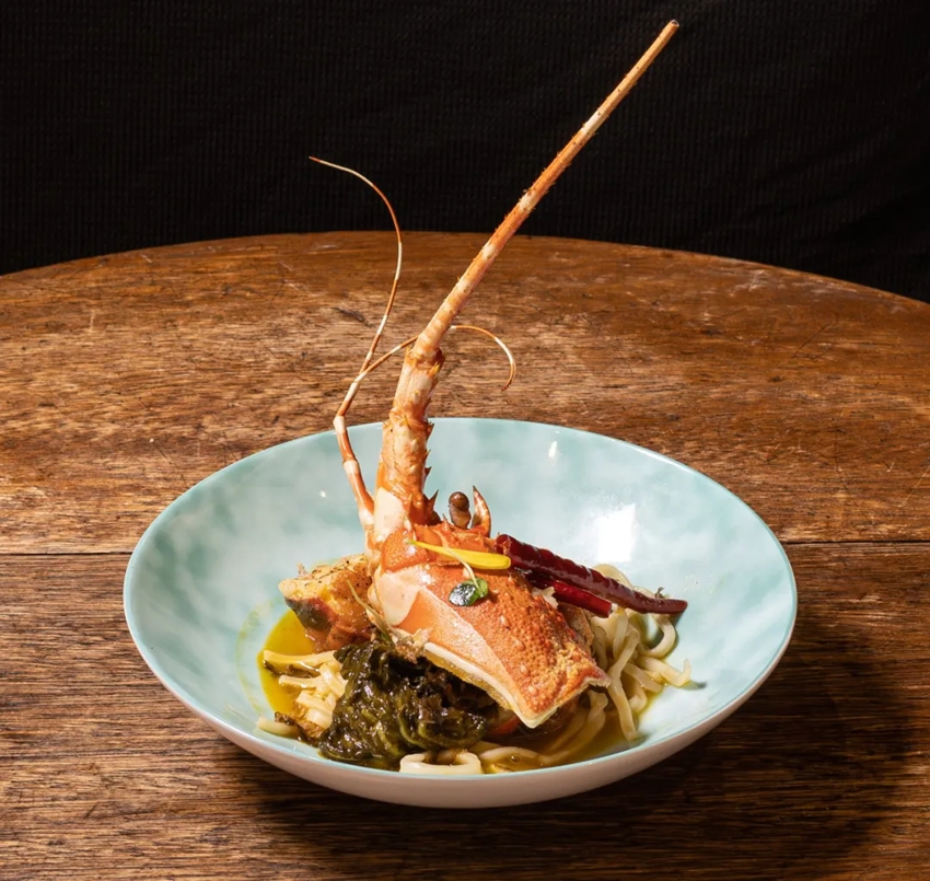 蓬华屁股面已有上百年的历史,用面粉和面碱,加温水和盐搅拌,揉成面团,再放在宽大的案板之上,利用木棍上下移动对面团进行碾压。碾压过程中保持平衡、用力均匀,压出来的面劲道十足、Q弹顺滑、香气浓郁。精心熬制的酸菜面汤,滋味十足,汤鲜味美,屁股面过水下锅煎干至面饼,再以酸汤浸没,佐以炸酥后又经调味煸炒的龙虾肉和切块酸菜,象征“欣欣向荣”,以及郑成功似蛟龙“乘风武荣”的精神。公元1661年4月21日,郑成功率领两万五千多名将士,五百多艘战船,从金门的料罗湾出发,浩浩荡荡,横渡海峡,向东挺进,拉开了收复台湾的战局,赢得了两岸同胞的民心。
