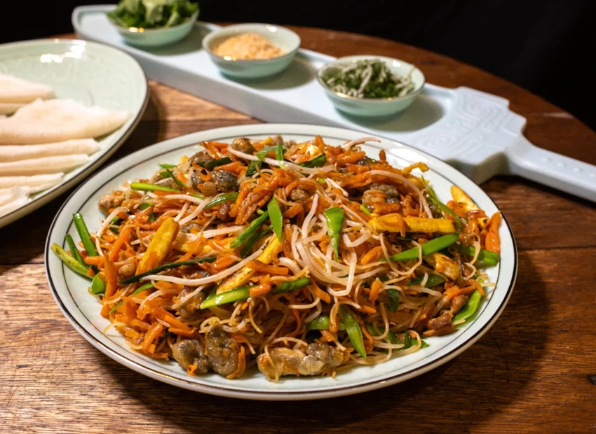 润饼皮的圆形象征着家庭的团圆,其白皮红馅的特征被称为“金包银”,寓意着招财进宝,深受泉州人喜爱。制作润饼菜时,馅料通常以时令食材为主,如胡萝卜、乳豆、蒜仔、韭菜、芫荽、海蛎等食材。润饼菜是一道传统美食,更是一种传承文化。公元1661年4月,郑成功军队彻底击溃荷兰侵略者,顺利登岛,台湾人民欢呼雀跃,争相拿出自己的食物犒劳士兵。闽南传统风味润饼菜,五颜六色,咬之如春,生机勃勃,满口留香。